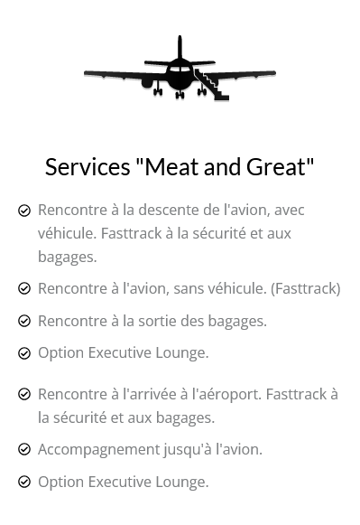 Notre service Meet and Greet commence dès votre arrivée à l'aéroport. Un de nos agents vous attend à la sortie de l'avion avec un panneau à votre nom, prêt à vous assister avec vos bagages et à vous escorter à travers l'aéroport avec un service de fast track à la sécurité.