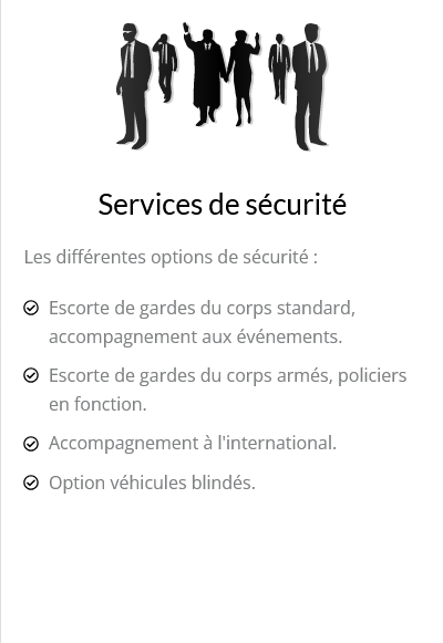 Oui, nous offrons des services de sécurité comprenant des gardes du corps standard et armés, ainsi que des véhicules blindés pour assurer votre protection maximale.